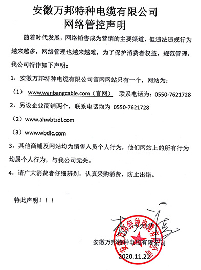 鄭重聲明:安徽萬邦特種電纜有限公司官方網站為:www_wanbangcable_com.honglingpv.com,除此之外無任何子網站或合作網站,其余均為假冒偽劣。電話:0550-7621728 13485756353 地 址:安徽省天長市滁州高新技術產業開發區經四路29號